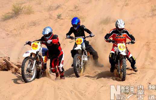 |  7月29日,幾名參賽選手在沙漠里艱難騎行。 中廣網(wǎng)呼和浩特7月30日消息 首屆內(nèi)蒙古自治區(qū)環(huán)冬青湖摩托車(chē)賽29日在內(nèi)蒙古磴口縣烏蘭布和沙漠深處的冬青湖旅游度假村舉行,來(lái)自天津、山西、陜西、寧夏、內(nèi)蒙古等8?jìng)(gè)省區(qū)市的22個(gè)代表隊(duì)、近80名選手參加了比賽。