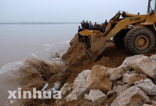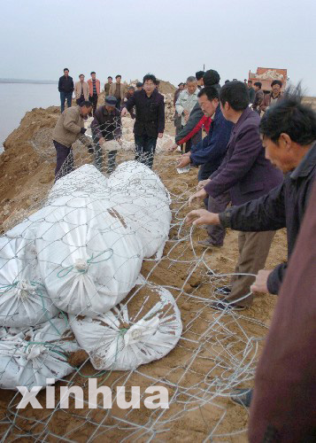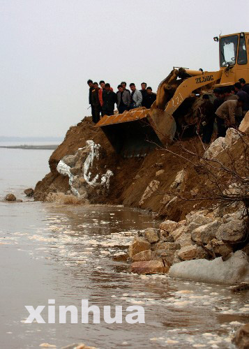 3月22日,搶險人員正在加厚發(fā)生險情的黃河堤壩。3月21日下午,黃河內(nèi)蒙古準格爾旗李三壕河段出現(xiàn)流凌淘岸險情。當?shù)胤姥床块T動用260多人和140余輛汽車、工程車日夜搶險。目前淘岸險情得到初步控制。 新華社記者 任軍川攝