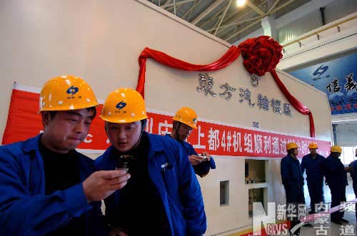 兩名工人在上都電廠(chǎng)新投產(chǎn)的4號(hào)機(jī)組旁欣賞自己與汽輪機(jī)的留念照片