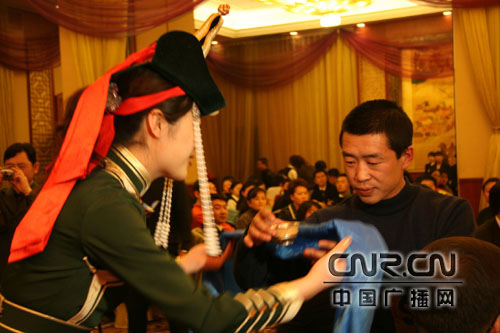 飯店工作人員用蒙古族最高禮向外來(lái)務(wù)工人員敬酒