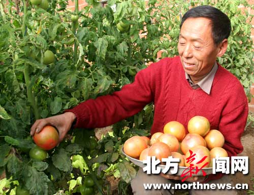 26日,呼和浩特市賽罕區(qū)大廠庫倫村三元無公害蔬菜基地的村民正在采摘新鮮西紅柿。據(jù)了解,該蔬菜基地的大棚外墻采用磚體聚苯材料夾層建成,能在棚外零下30攝氏度的環(huán)境里生產(chǎn)無公害蔬菜,以滿足市場需要。(辛永紅)