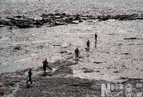 3月11日,武警戰(zhàn)士在黃河冰面上尋找安放炸藥地點(diǎn)