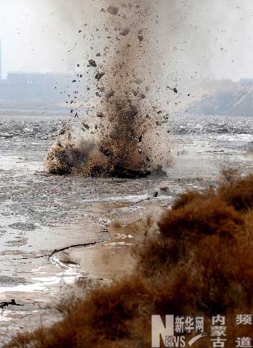 3月11日,內(nèi)蒙古烏海市在黃河烏達(dá)段進(jìn)行黃河流凌爆破分凌演練,以應(yīng)對(duì)可能發(fā)生的黃河凌汛險(xiǎn)情。由于目前內(nèi)蒙古河段河槽蓄水量達(dá)18億立方米,較多年平均值高出50%,且分布不均,加之一些河段早已形成的“懸河”形態(tài)及堤防達(dá)標(biāo)率低,防凌形勢(shì)為40年來(lái)最嚴(yán)峻的一年。 (任軍川)