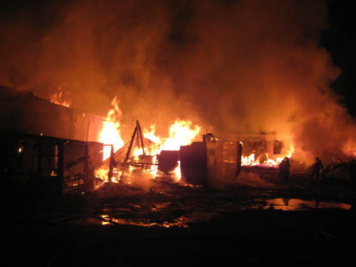 6日晚上21時56分,滿洲里市消防特勤大隊接到報警,并迅速出動3輛消防車、23名官兵趕赴現(xiàn)場。當官兵距離火場1公里時,就能看到火光在黑夜中染紅了半邊天。指揮員意識到火場形勢比較嚴峻,隨即調(diào)集一中隊2輛、二中隊1輛消防車增援。