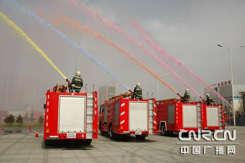 演練結(jié)束后,顏炳強(qiáng)局長(zhǎng)在有關(guān)領(lǐng)導(dǎo)的陪同下,參觀了廣場(chǎng)四周展示的各種先進(jìn)消防裝備,親切慰問了消防官兵,并認(rèn)真聽取了他們對(duì)所操作裝備的講解。展示的裝備包括通信指揮車、消防水罐車、高噴消防車、云梯消防車、高架平臺(tái)消防車、設(shè)備檢修車、伙食保障車,以及新裝備的消防坦克。