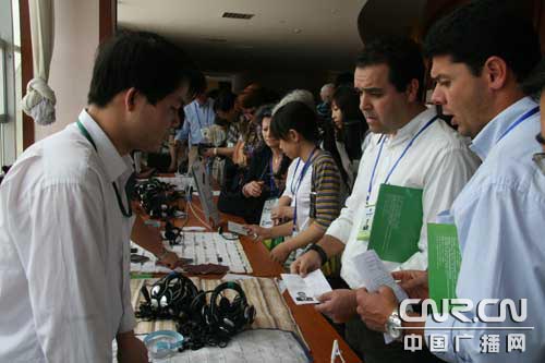 進入會場前,與會人員領(lǐng)取翻譯耳機,并登記所需語言