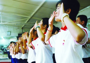 30張陽光般燦爛的笑臉,30雙有力的臂膀,30顆金子般的心靈,共同演繹《感恩的心》。“表情不夠自然,動作不夠統(tǒng)一!敝笇(dǎo)老師康海琴對記者說。隨后,康海琴用手語將她的態(tài)度傳達給了30名聾啞學(xué)生。一遍又一遍,他們時而雙手環(huán)抱前胸,時而用手比劃成一個“心”,用心去詮釋這首歌曲。雖然不能說話,但他們齊刷刷地用手“舞”出這首歌曲時,是另外一種震撼。他們的節(jié)目將在火炬?zhèn)鬟f的終點進行演出。