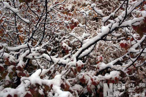 10月5日,在內(nèi)蒙古克什克騰旗,秋雪掛滿枝頭樹葉。 當(dāng)日,受冷空氣影響,內(nèi)蒙古克什克騰旗降下秋雪。 新華社發(fā)(孫國樹 攝)