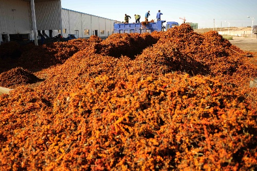 10月30日,農(nóng)民正在東勝區(qū)一家沙棘生產(chǎn)企業(yè)交售沙棘果。 內(nèi)蒙古鄂爾多斯是我國(guó)重要的沙棘產(chǎn)地,沙棘保存面積達(dá)300多萬(wàn)畝,約占全國(guó)沙棘總面積的70%。近年來(lái),鄂爾多斯市引進(jìn)幾家大型沙棘加工企業(yè),使沙棘在發(fā)揮生態(tài)效益的同時(shí)也產(chǎn)生了很大的經(jīng)濟(jì)效益,項(xiàng)目區(qū)內(nèi)農(nóng)民每年從沙棘種植、管護(hù)、摘果等方面人均增加收入近千元。