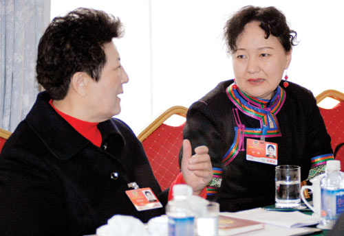 3月4日,全國(guó)政協(xié)委員德德瑪(左)與內(nèi)蒙古全國(guó)政協(xié)委員杜梅在民族組分組討論會(huì)上交流。 記者 袁永紅 攝