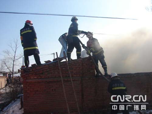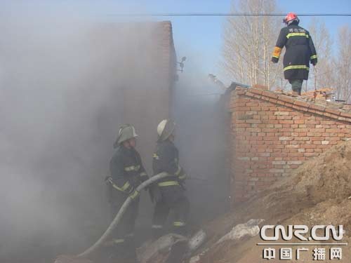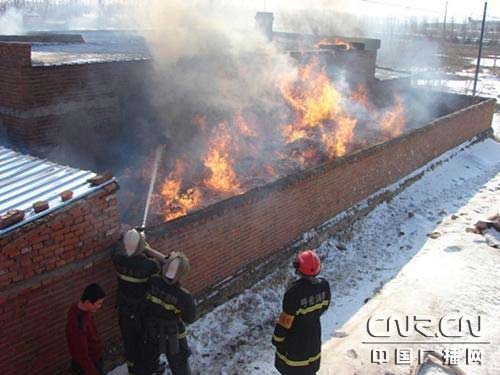 當(dāng)日下午14時(shí)18分,阿榮旗消防接到報(bào)警后,迅速出動(dòng)3臺(tái)消防車,14名指戰(zhàn)員趕赴火場。到達(dá)現(xiàn)場時(shí)火勢(shì)正處于猛烈燃燒階段,并且草垛呈一字形倚房堆放、體積比較龐大,戰(zhàn)斗空間狹窄,火焰倚房燃燒,加上草垛堆放的地點(diǎn)正好處于房屋后窗,此時(shí)大火正從三個(gè)后窗戶破窗而入,同時(shí)著火草垛東側(cè)一倉房也已經(jīng)被烤燃,房屋和倉房很容易被全部燒毀造成全家無處居住,后果將不堪設(shè)想;饒鲋笓]員根據(jù)火場情況立即下達(dá)了作戰(zhàn)命令, 將參戰(zhàn)官兵立即分成二個(gè)戰(zhàn)斗小組。第一組:出一支水槍迅速控制草垛火勢(shì)繼續(xù)蔓延;第二組:出一支水槍進(jìn)入室內(nèi)窗口阻止火勢(shì)向室內(nèi)蔓延。由于草垛四周被墻圍住,很難從正面攻擊明火,火場指揮員立即命令對(duì)失火草垛旁的倉庫房頂進(jìn)行破拆,然后利用單杠梯攀至屋頂從高處滅火。待火勢(shì)得到控制,確定民房不會(huì)受到危害后,參戰(zhàn)官兵在村民的配合下利用二齒鉤、叉子等工具將柴草攀扒,兩組同時(shí)進(jìn)攻將草垛底部余火徹底撲滅。