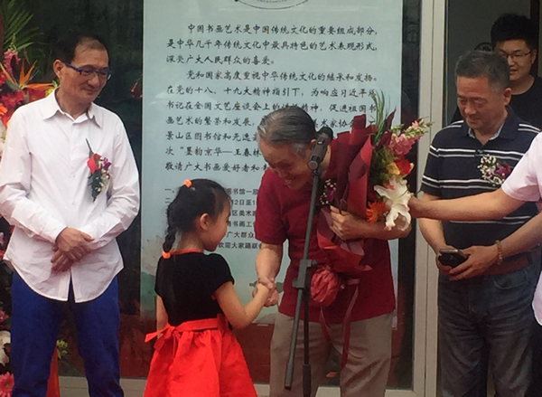 央廣網(wǎng)北京5月12日消息(記者馮玉婷)“幾代學(xué)員同作畫,公益課堂無逸齋”。隨著7歲小學(xué)生、超市收銀員、企業(yè)高管與73歲的書畫家王春林同臺同畫《富貴和諧》,王春林從藝60周年書畫展于2018年5月12日在北京市石景山區(qū)圖書館開幕,王春林所作的百幅山水、花鳥等國畫精品及篆、隸、草、行、楷等多種書體的書法精品將免費向公眾展出。這是北京市石景山區(qū)美術(shù)家協(xié)會、北京市石景山區(qū)圖書館、無逸齋書畫工作室聯(lián)合主辦的公益展覽教育活動。北京市石景山區(qū)文聯(lián)主席郭明、石景山區(qū)圖書館館長吳私、知名書畫評論家阿登、中國文化義工聯(lián)合會副主席王勝利等出席開幕式并致辭。