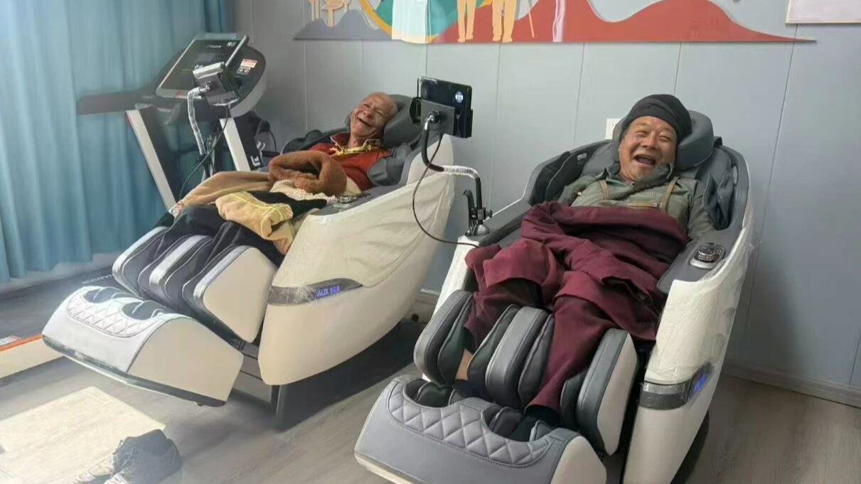 一張張老人們下棋娛樂的照片,一個(gè)個(gè)按摩椅,還有廚房里微波爐、蒸鍋,整齊的碗筷……勾勒出一幅晚年生活的美麗畫卷。