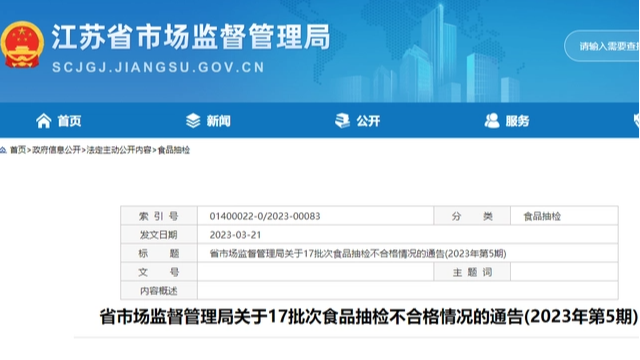 3月21日,江蘇省市場(chǎng)監(jiān)督管理局發(fā)布17批次食品抽檢不合格情況的通告(2023年第5期)。內(nèi)容顯示,宿遷、鎮(zhèn)江、南京、無(wú)錫、鹽城等多地經(jīng)營(yíng)企業(yè)銷售和使用的食品、餐飲具抽檢不合格。