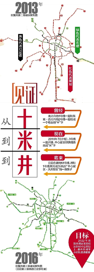 2016年7月31日,3號線一期開通,中心城區(qū)地鐵線路畫成“米”字