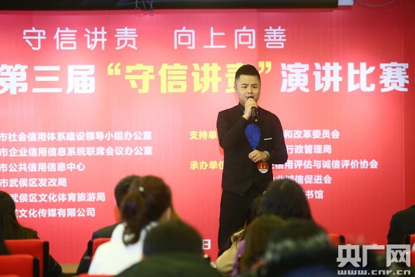 央廣網(wǎng)成都12月27日消息(記者韓民權(quán))為貫徹落實(shí)“十九大”精神,踐行社會主義核心價值觀,積極推動成都市社會信用體系建設(shè)。12月27日,成都市第三屆“守信講責(zé)”演講比賽在成都武侯區(qū)圖書館舉行。30余位選手圍繞“守信講責(zé) 向上向善”的主題上演了精彩演講。