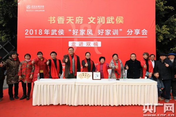 央廣網(wǎng)成都1月28日消息(記者韓民權(quán))為踐行社會主義核心價值觀,使文化融入百姓生活。1月28日,由成都市武侯區(qū)圖書館主辦的“書香天府·文潤武侯‘好家風·好家訓’分享會”第二站在成都武侯區(qū)雙楠街道舉行,將多彩的文化活動送到了百姓身邊。當天,分享嘉賓與市民代表們分享了自己的好家風故事,并將優(yōu)秀的家風、家訓存入了“家風銀行”。