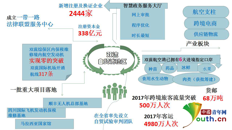 中國(guó)青年網(wǎng)成都6月7日電(劉洪材 記者 李建軍 實(shí)習(xí)生 張徐)在成都雙流自貿(mào)試驗(yàn)區(qū)34.01平方公里的“試驗(yàn)田”上有一張成績(jī)單:全面完成2017年87項(xiàng)改革試驗(yàn)任務(wù)、去年實(shí)現(xiàn)主營(yíng)業(yè)務(wù)收入1429億元、稅收81.4億元(含海關(guān)稅收)、自貿(mào)試驗(yàn)區(qū)智慧政務(wù)服務(wù)大廳開(kāi)發(fā)運(yùn)營(yíng)、新增注冊(cè)及換證企業(yè)2444家、綜保區(qū)內(nèi)貨物流轉(zhuǎn)由9小時(shí)縮短至9分鐘、2017年實(shí)現(xiàn)旅客吞吐量4980萬(wàn),全國(guó)排名第四……