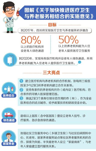 四川出臺(tái)《加快推進(jìn)醫(yī)療衛(wèi)生與養(yǎng)老服務(wù)相結(jié)合的實(shí)施意見(jiàn)》到2017年,80%以上醫(yī)療機(jī)構(gòu)開(kāi)設(shè)老年人就醫(yī)綠色通道