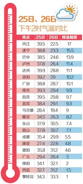 除了內(nèi)江,遂寧、巴中、瀘州等地的氣溫也是嚴(yán)重“縮水”,下降幅度分別為15.5℃、13.9℃、11.4℃。最穩(wěn)得起的是攀枝花,只降了1℃。