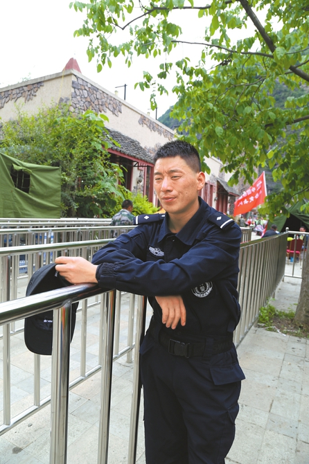 26日上午11點(diǎn),茂縣疊溪新磨村,陽(yáng)光射在臉上有點(diǎn)火辣。樹(shù)蔭下的鐵護(hù)欄旁,剛剛輪換下來(lái)的高猛,用帽子扇著風(fēng),一臉汗?jié)n。