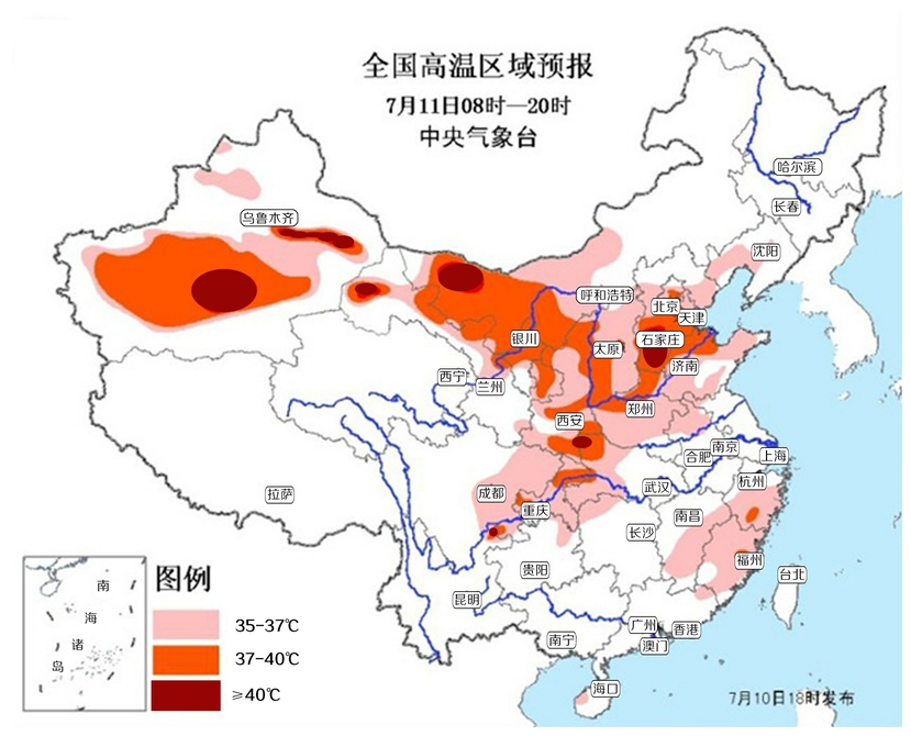 中央氣象臺7月10日18時繼續(xù)發(fā)布高溫黃色預警:預計,7月11日白天,華北中南部、黃淮、西北地區(qū)東部、內蒙古西部、甘肅中西部、新疆南疆盆地、四川盆地、湖北西部以及浙江中南部、福建、江西東部等地有35℃以上的高溫天氣,其中,河北中南部、河南北部、山東北部、內蒙古西部、甘肅西部、寧夏、山西西南部、陜西關中地區(qū)和南部、浙江南部、福建東部以及新疆南疆盆地等地的部分地區(qū)最高氣溫可達37-39℃,局地可超過40℃。(記者吳冰清)
