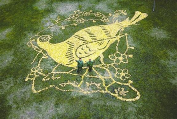 3日上午,郫都區(qū)置信逸都小區(qū)內(nèi),老何和搭檔花了近4個小時在小區(qū)中庭的大草地上“畫”出了一幅銀杏新作——臘梅花開枝頭,畫眉回眸而棲!斑要再改改,看上去全是線條!崩虾螌@幅銀杏圖不是很滿意。吃過午飯,他讓搭檔老王再去拉些銀杏葉來,“把畫眉用葉子填滿,把線條用草地本身體現(xiàn),讓它更渾然一體,更有沖擊力。”