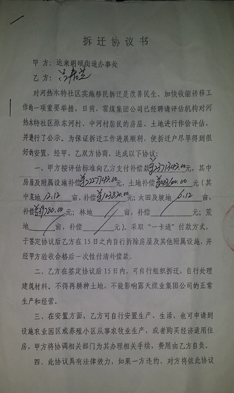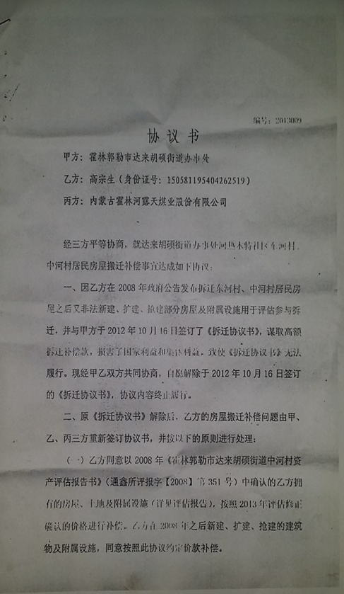 2011年下半年又開(kāi)始啟動(dòng)拆遷,2012年10月政府和村民按照原評(píng)估方案簽訂補(bǔ)償協(xié)議。村民按照協(xié)議15日內(nèi)進(jìn)行了拆遷,拆完之后由于補(bǔ)償金額過(guò)大,露天礦業(yè)不認(rèn)可政府與村民之間的補(bǔ)償協(xié)議,無(wú)奈政府終止履行。