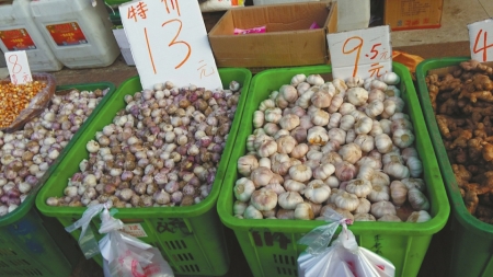 記者在其他菜市場發(fā)現(xiàn),10元一斤已是普通大蒜的最低零售價,而紫皮獨(dú)瓣蒜價格已經(jīng)漲到了13元一斤。在一家大型超市,記者發(fā)現(xiàn),普通大蒜價格為10.8元一斤,獨(dú)瓣蒜價格更是高達(dá)16元一斤。
