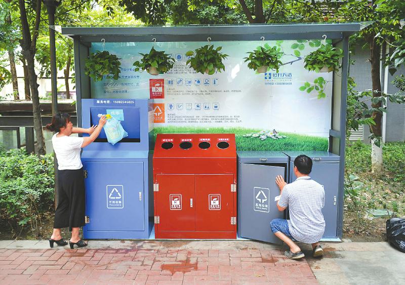 8月1日,成都市成華區(qū)府青路街道一居民小區(qū),居民正在往專設的分類垃圾箱內扔垃圾。