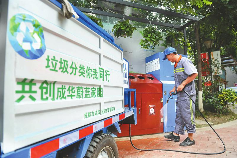 環(huán)衛(wèi)公司工作人員每日定期收取居民投放的垃圾,并清潔垃圾箱。
