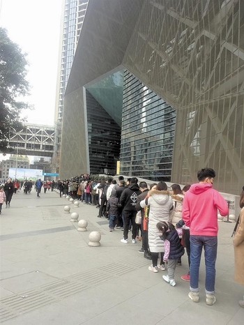 昨日下午2點,記者來到成都博物館,遠遠就看到排隊等待進館的隊伍,已從博物館門口延伸到了地鐵口,隊伍里有市民樂觀地表示,前幾天排隊的人更多。