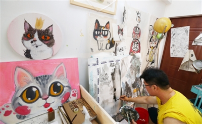 伍林發(fā)現(xiàn)自己的畫火了,緣于一副他創(chuàng)作的胖貓露牙的《虎嘯山林圖》火了,竟有不少人想花錢買下。2004年,伍林從四川大學(xué)藝術(shù)學(xué)院油畫班肄業(yè),進(jìn)了游戲公司負(fù)責(zé)美術(shù)設(shè)計(jì)。后來,他辭職赴上海工作。團(tuán)隊(duì)建設(shè)、產(chǎn)品設(shè)計(jì),慢慢地,游戲開發(fā)工作讓他心生厭倦。2015年年底,辭職后的伍林又回到成都,開始“專職”畫貓。因?yàn)楫嬝垼咽蔷W(wǎng)上紅人,賣畫收入超過做游戲開發(fā)總監(jiān)時(shí)的收入。現(xiàn)在,他的微博@還是一碗泡面已擁有117萬粉絲。因知道自己拖稿,他從不接訂單也不跟機(jī)構(gòu)合作,因?yàn)楦鷻C(jī)構(gòu)簽了合同后,就要受截稿時(shí)間限制,這不符合他“想畫就畫”的風(fēng)格。成都商報(bào)記者 于遵素 攝影記者 王紅強(qiáng)