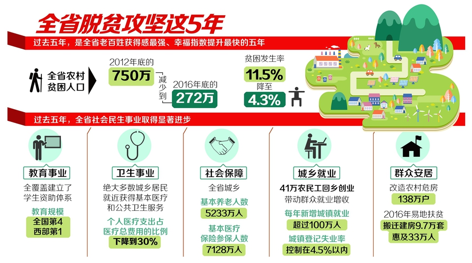 過去的五年,是全省老百姓獲得感最強(qiáng)、幸福指數(shù)提升最快的五年。脫貧攻堅(jiān)取得階段性重大成就,去年四川脫貧攻堅(jiān)工作被國家列為綜合評價(jià)好的8個省份之一。全省農(nóng)村貧困人口從2012年底的750萬減少到2016年底的272萬,貧困發(fā)生率從11.5%降至4.3%。