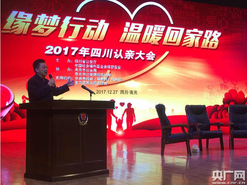 央廣網(wǎng)成都12月27日消息(記者劉濤)12月27日上午,“緣夢行動,溫暖回家路”2017四川大型認(rèn)親大會在南充順慶大禮堂舉行。7名被拐20多年的受害人,與家人得以團(tuán)聚。