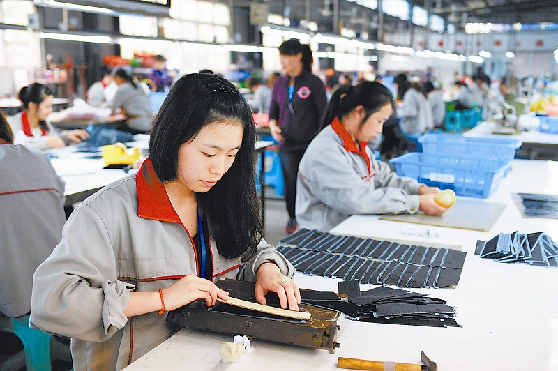 富順縣紅谷實(shí)業(yè)有限責(zé)任公司的員工在生產(chǎn)車(chē)間制作皮包。該企業(yè)是典型的勞動(dòng)密集型企業(yè)。 本報(bào)記者 李向雨 攝(資料圖片)