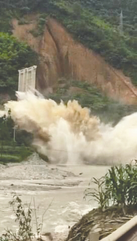 一開始,畫面中的一大片山體就開始垮塌,沖向位于河邊的六根至少10多米高的橋墩。伴隨著圍觀人群的驚呼聲,最右邊的兩個橋墩最先出現(xiàn)明顯的傾斜,僅僅3秒的時間,橋墩下的山體也開始垮塌,橋墩倒向河中,與此同時,中間的兩根橋墩也開始傾斜。