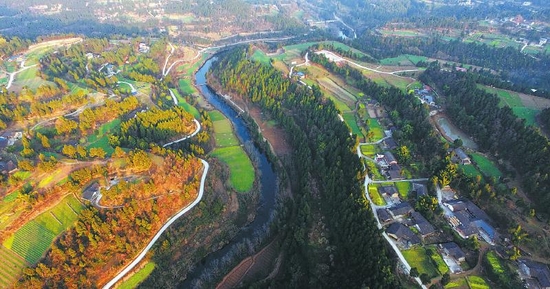 1月14日記者在閬中市棗碧鄉(xiāng)楊家河村上空俯拍的楊家河沿線風(fēng)光。目前該村新開辦農(nóng)家樂8家,旺季日均接待游客達到1500人次。本報記者李向雨攝 原標題:小河溝里搞旅游 村民致富有奔頭