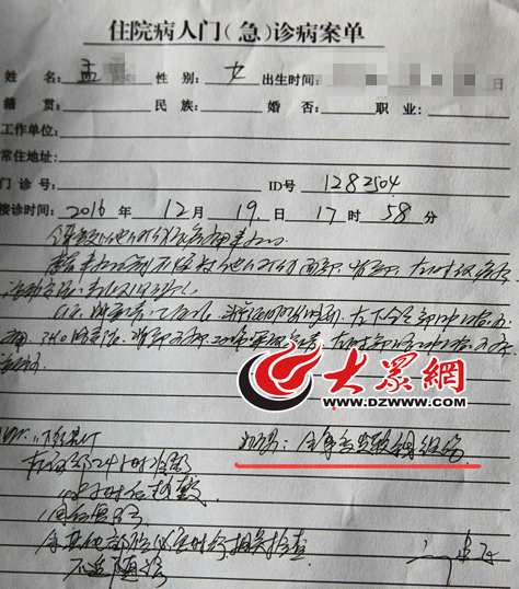 事發(fā)當天下午,孟女士到醫(yī)院急診治療的病案單。