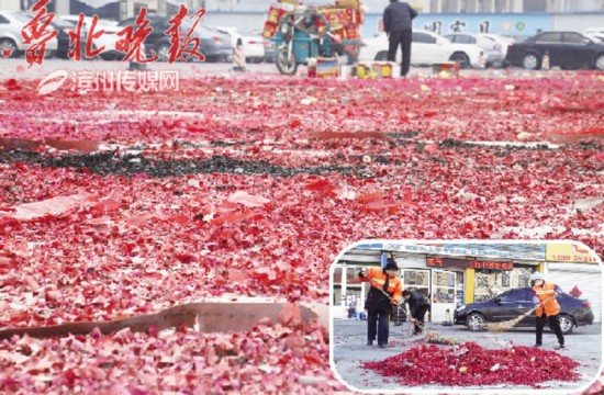 2月2日,是大年初六,不少商家都會按照習俗燃放“開門”鞭炮,隨之而來的一地鞭炮皮成了令環(huán)衛(wèi)工人頭疼的“紅色垃圾”。自大年初二開始,濱州市城管執(zhí)法局環(huán)衛(wèi)處每天清理出的街道垃圾有三分之一是鞭炮皮。
