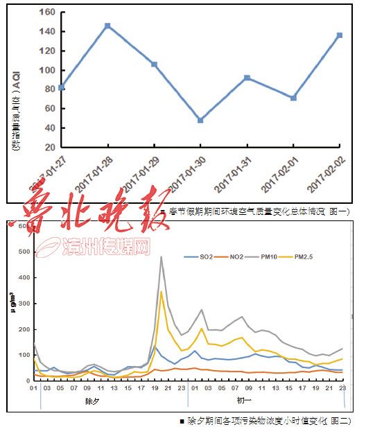 19時至20時,濱州市區(qū)環(huán)境空氣中PM10和PM2.5濃度值發(fā)生驟然上升,分別由200μg/m3上升至480μg/m3、107μg/m3上升至345μg/m3,上升幅度為分別是140%、222%,空氣質(zhì)量等級由三級上升為六級,污染程度由輕度污染變成嚴重污染程度,21時以后各污染物濃度有所下降,初一的1時至2時和5時至7時,也分別出現(xiàn)各污染物濃度上升情況,但上升幅度均低于除夕期間。