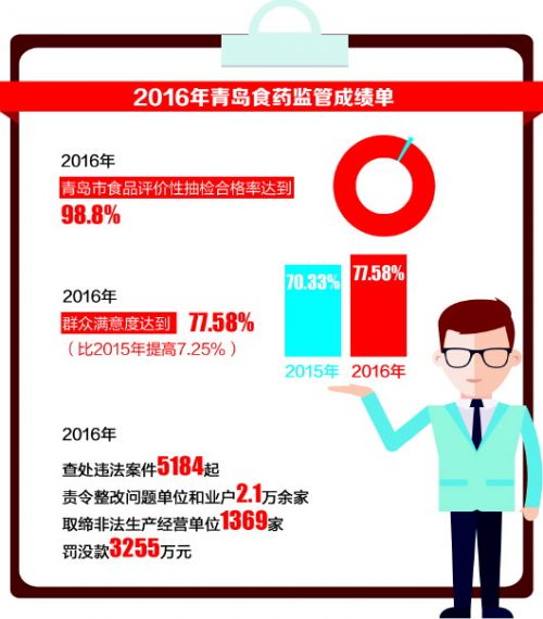 2月7日,記者從2017年創(chuàng)建國家食品安全示范城市推進(jìn)會暨食品藥品監(jiān)督管理工作會上獲悉,去年,青島市食品評價性抽檢合格率達(dá)到98.8%,社情民意調(diào)查群眾滿意度達(dá)77.58%,處于歷史最高水平。去年,各級各部門共查處違法案件5184起,責(zé)令整改問題單位和業(yè)戶2.1萬余家。今年,本市將繼續(xù)加大食藥工作的監(jiān)管力度,市食藥監(jiān)局列出今年重拳整治的三個方向。