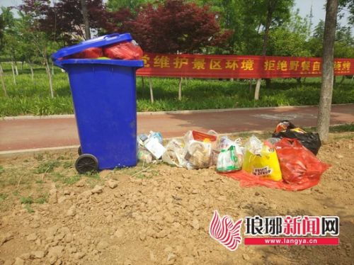 在濱河景區(qū)暢園內(nèi),沂蒙晚報(bào)記者看到隨處懸掛著“自覺(jué)維護(hù)景區(qū)環(huán)境,拒絕野餐自助燒烤”的紅色條幅。在路邊一處垃圾桶旁,沂蒙晚報(bào)記者看到,藍(lán)色的垃圾桶里已經(jīng)裝滿了垃圾,垃圾桶的蓋子都蓋不上了,垃圾桶旁邊是一袋袋的垃圾。