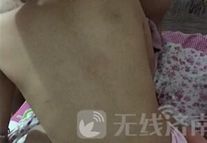 從這個(gè)女士昨晚拍攝的照片可以看出,四歲的小女孩陽陽的兩側(cè)肩膀、以及后背有多處青紅?吹胶⒆由砩系膫,鄭女士和丈夫今天一早便來幼兒園查看了監(jiān)控。