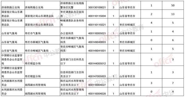 報名人數(shù)最少的是棗莊銀監(jiān)分局信息科技部門主任科員及以下崗和南四湖水利管理局韓莊運河水利管理局主任科員及以下崗(法學(xué)專業(yè)),報考人數(shù)均為4人。