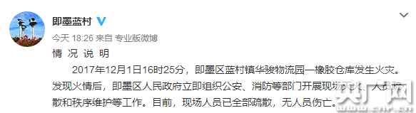 央廣網(wǎng)青島12月1日消息(記者 劉?)記者從青島市即墨區(qū)藍(lán)村鎮(zhèn)官方微博獲悉,今天(1日)16時(shí)25分,青島市即墨區(qū)藍(lán)村鎮(zhèn)華駿物流園一橡膠倉(cāng)庫(kù)發(fā)生火災(zāi)。發(fā)現(xiàn)火情后,即墨區(qū)人民政府立即組織公安、消防等部門(mén)開(kāi)展現(xiàn)場(chǎng)滅火、人員疏散和秩序維護(hù)等工作。目前,現(xiàn)場(chǎng)人員已全部疏散,無(wú)人員傷亡。