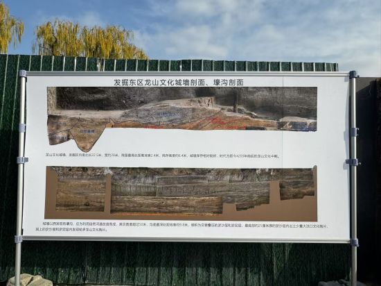此次發(fā)掘最核心的成果是龍山文化城墻及壕溝的發(fā)現(xiàn)。該城墻位于發(fā)掘區(qū)東端,南北長22.5米且向兩側(cè)延伸出發(fā)掘區(qū),寬約28米,殘存高度約6.4米,為人工層層堆筑而成。城墻內(nèi)出土磨光黑陶片、刻有精美紋飾的蛋殼陶片等典型龍山文化遺物,還發(fā)現(xiàn)1例人頭骨,推測城墻建造過程中可能存在祭祀活動。經(jīng)碳14測年及專家論證,該城墻為龍山文化時期城址西城墻,距今約4200年,且有岳石文化及戰(zhàn)國時期補筑痕跡。
