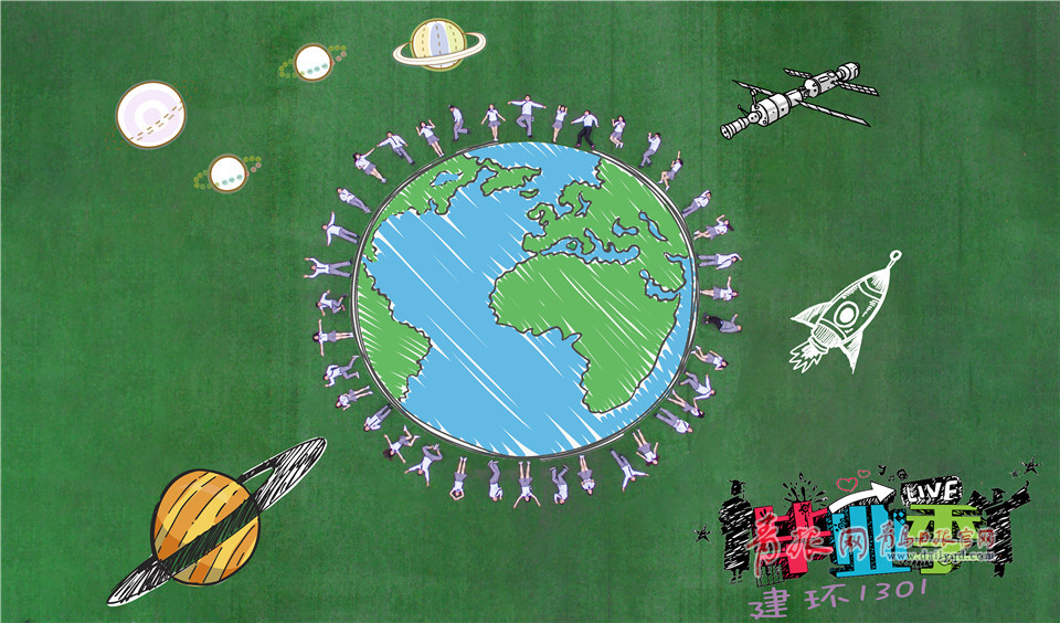 地球和宇宙的圖案,是新世界的象征。大家站在地球上的每個角落,奔跑跳躍,代表著對新世界的渴望和追求。為了使畫面活躍,全部采用了手繪卡通畫的風格,體現(xiàn)出世界的多彩與美好。