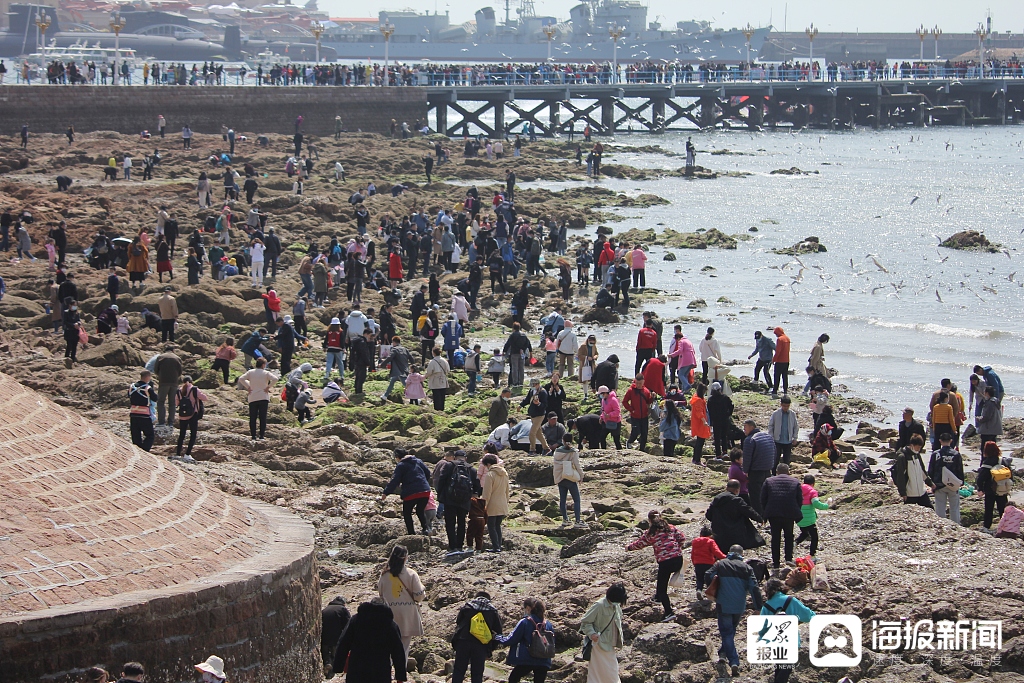2021年4月11日,游人在青島棧橋景區(qū)趕海。當(dāng)日是周日,許多家長(zhǎng)帶著孩子來(lái)到棧橋景區(qū)趕海休閑,挖蛤蜊逮螃蟹,享受歡樂(lè)時(shí)光。
