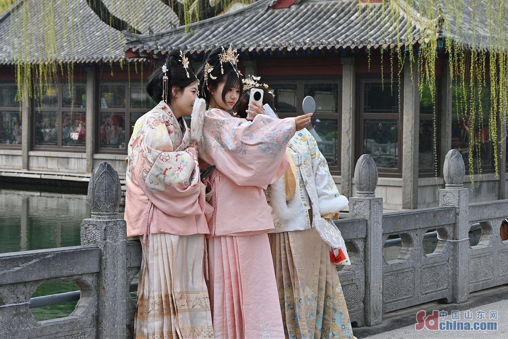 賞花人群中,身著漢服的年輕女生格外引人注目。她們或執(zhí)團扇倚欄而立,或輕提裙擺穿行花下,衣袂飄飄與繁花相映,成為園中一道流動的風景。泉水邊、古建旁、花樹下,處處可見她們拍照的身影,將傳統(tǒng)服飾之美與泉城春日風光完美融合。